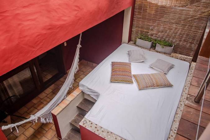 São dois ambientes: o primeiro é uma sala que abriga duas camas de solteiro, uma rede e a varanda onde há futons de casal exclusivos dessa acomodação - ótimos para relaxar após o dia de praia e passeios. E no outro ambiente fica a cama de casal Queen Size e o banheiro privativo do quarto.